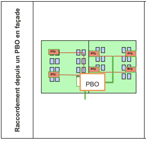 Le logement est dans un immeuble en copropriété et le PBO Équipement permettant de raccorder le câblage amont avec le câble de branchement directement raccordé au dispositif de terminaison intérieur optique. Le point de branchement optique peut se trouver en pied d’immeuble ou à l’extérieur de l’habitat ; dans ce cas, il permet de raccorder