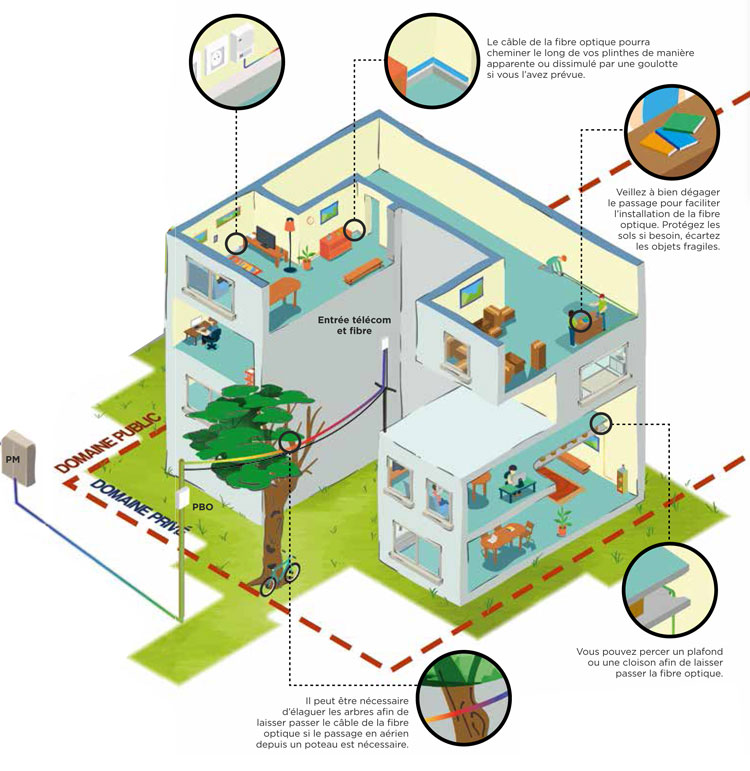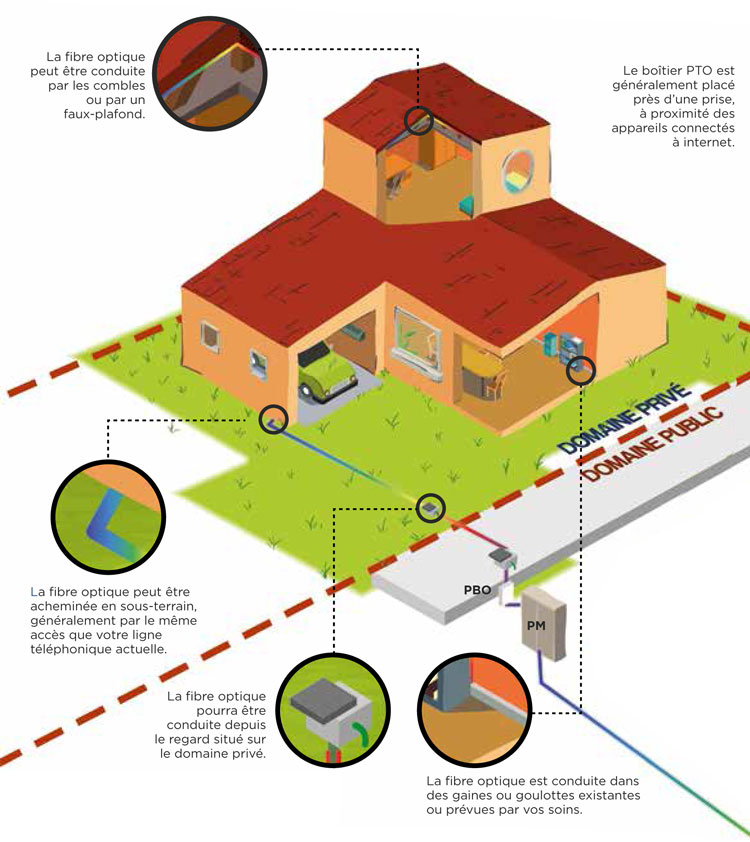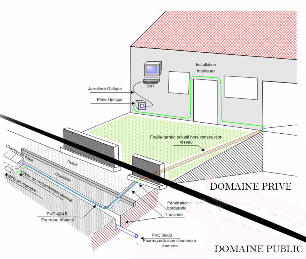 Le câble de raccordement optique empruntera le fourreau de votre raccordement téléphonique. Il est de votre propriété en zone privée et de la responsabilité du responsable d’infrastructure en zone publique. En tant qu’exploitant national des fourreaux télécoms historiquement de France Télécom c’est Orange qui est généralement en charge de maintenir les infrastructures.