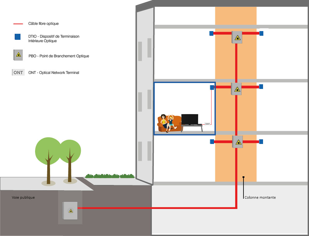 Cette liaison est réalisée avec un câble optique très fin de Ø4/5 mm dont la capacité est de 4 Fo. La prise « PTO » est installée dans le logement et permet le branchement direct de la box (dernière génération) de l’opérateur via une jarretière optique.
